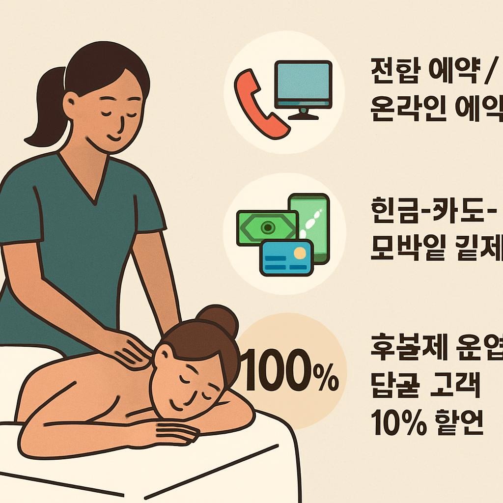 출장안마는 전화 예약 / 온라인 예약 모두 가능하며, 현금·카드·모바일 결제를 지원합니다.